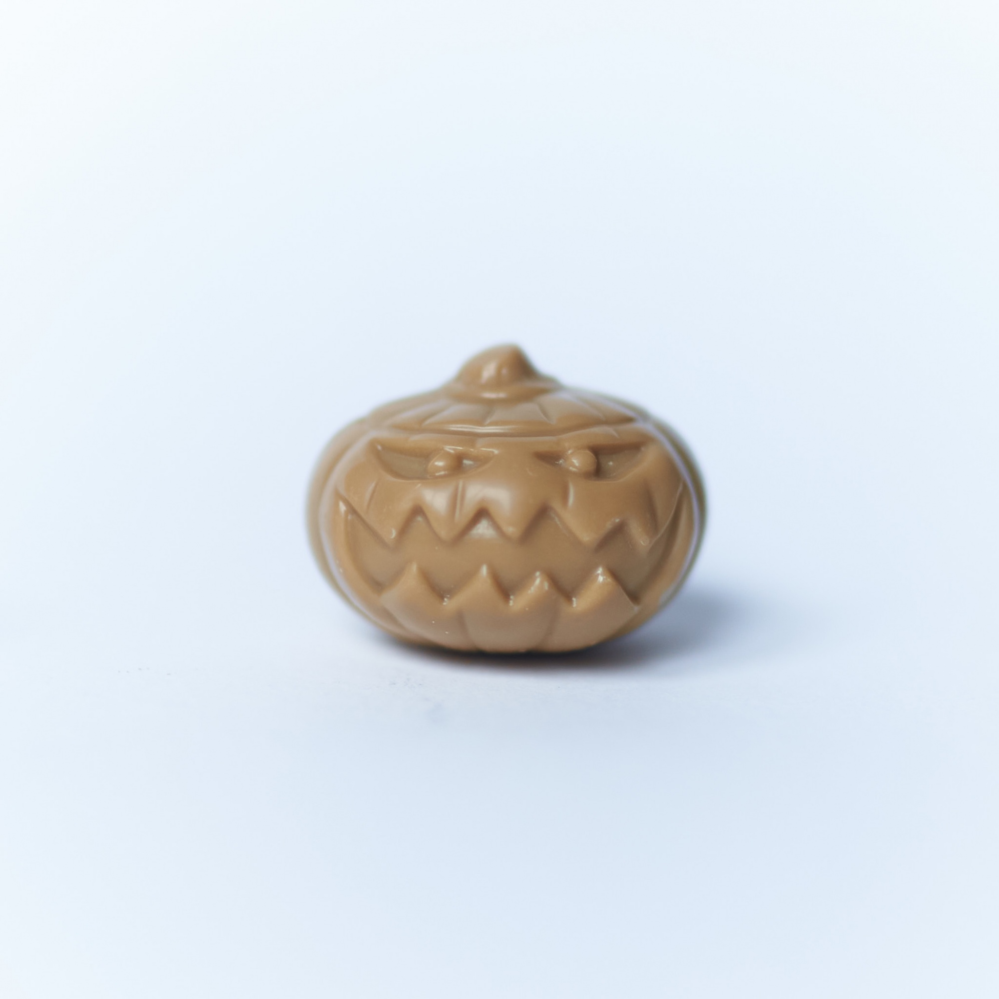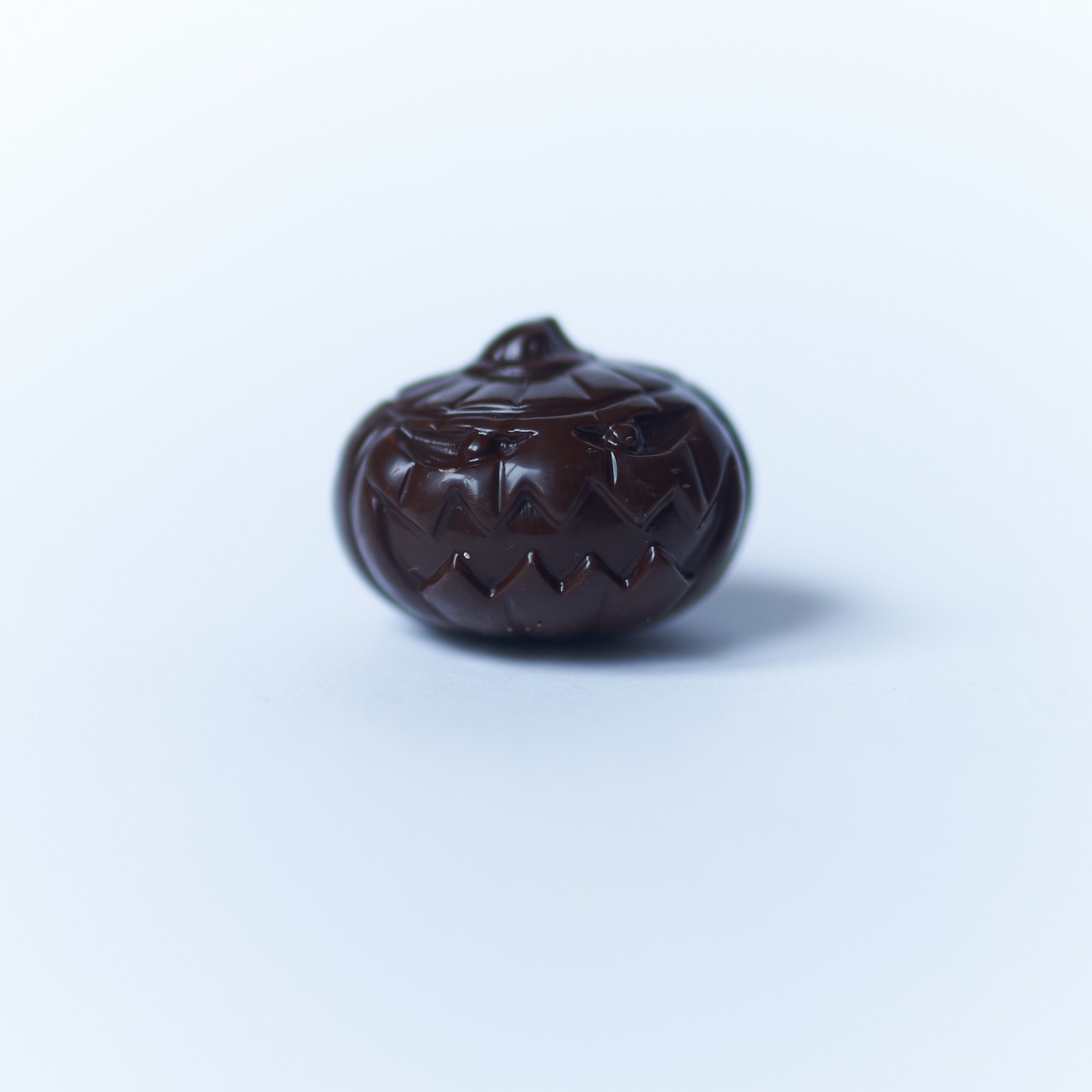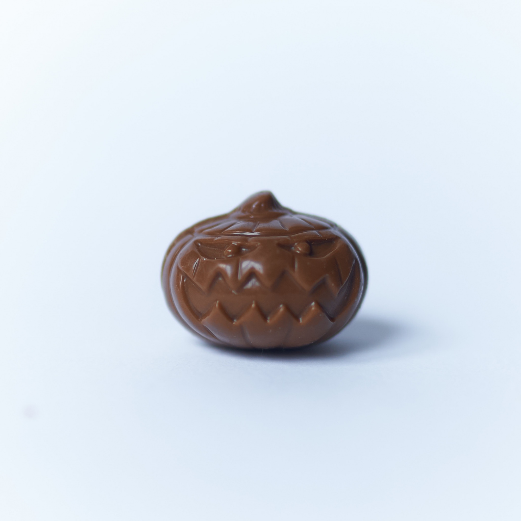 Ces chocolats en forme de citrouille, qu'ils soient noirs, au lait ou blonds, renferment un praliné aux amandes et des graines de courge.