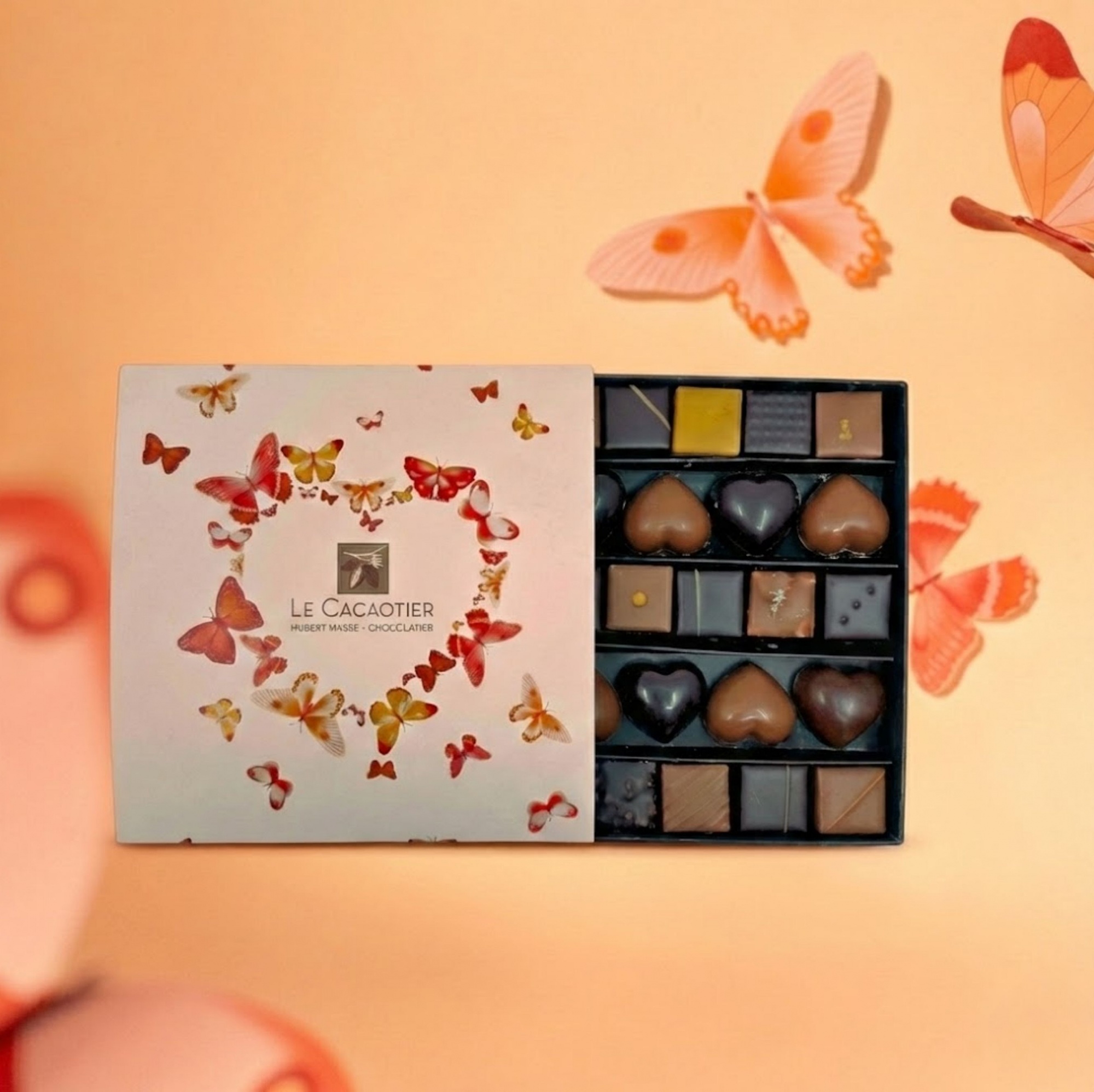 Succombez à notre coffret de chocolats spécial Saint-Valentin, une attention gourmande pour déclarer votre amour. Il associe des cœurs pralinés gianduja à de délicieux bonbons pralinés au chocolat noir et au lait. Disponible en 130 g et 215 g.