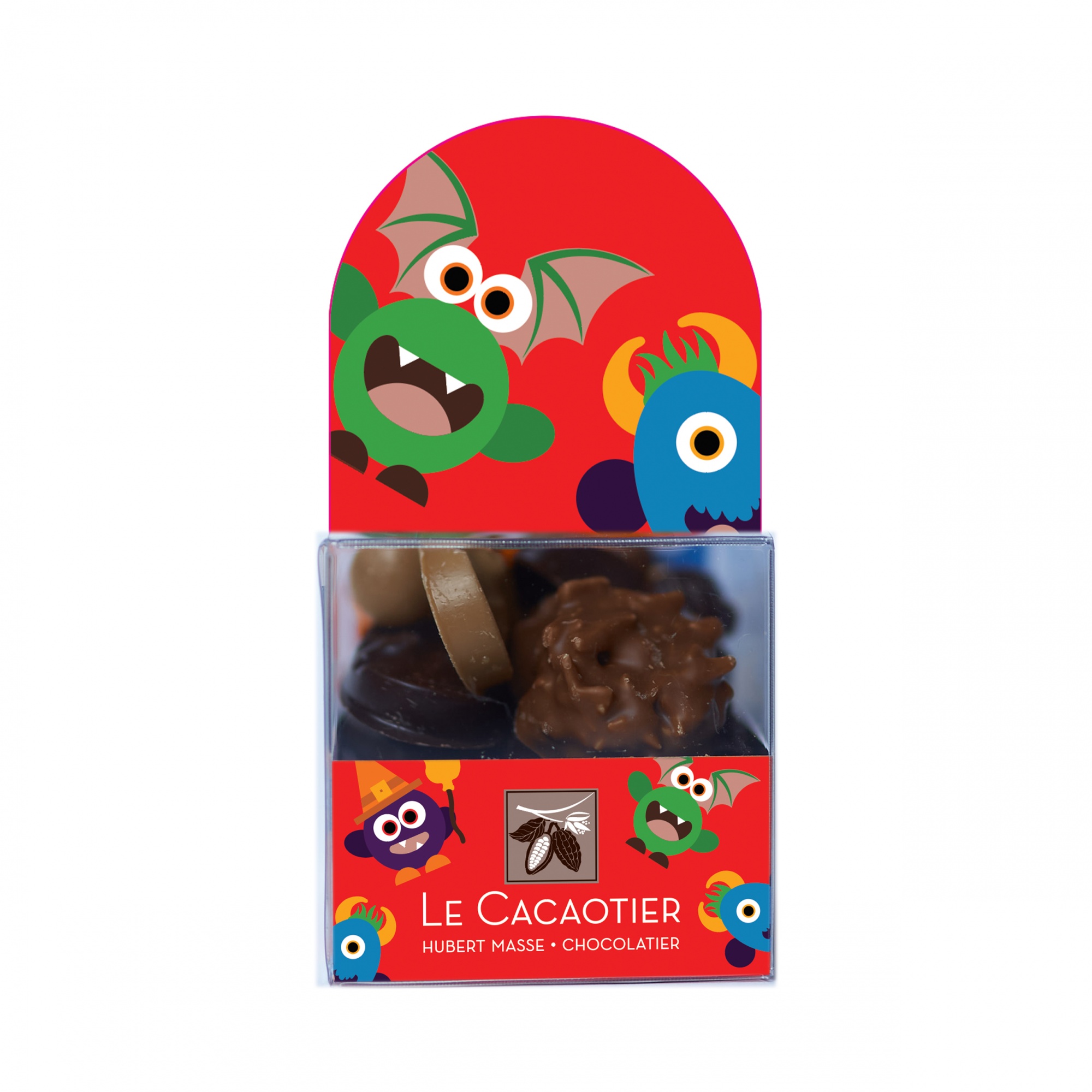 Cube assortiment Halloween garni d'une bouchée citrouille au praliné amande et graines de courge, de fritures (chocolat noir 66%, lait 41% et blond 35%), d'une sphère praliné noir et lait, de billes noisettes, de rochers suisses et orangettes.
